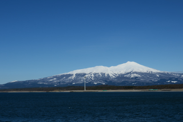 すっかり春めいてきた2月末 宮海海岸から鳥海山を撮影。海も穏やかで海の色も灰色だった冬の色から明るいブルーに変わってきていた。
