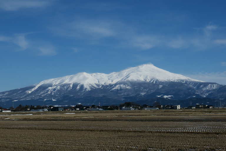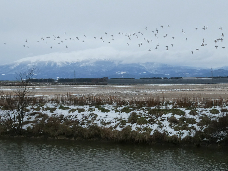 1月2日 今年初めて姿を現した鳥海山 川岸を歩いていたらカモたちが驚いて飛び立った